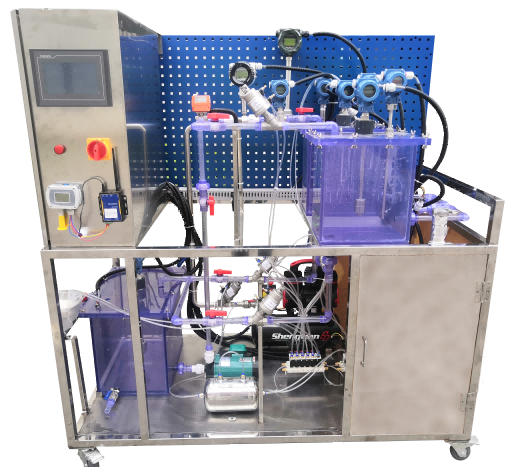 實(shí)訓臺以水、氣/汽、電能耗監測為背景,采用液位計、流量計、溫度變送器、壓力變送器、電磁閥、水泵、氣泵、電氣控制箱、水箱等裝置模擬工業(yè)場(chǎng)景下的水循環(huán)、氣循環(huán)、電能監測常見(jiàn)的過(guò)程控制系統。其中水箱作為液體盛放和氣體導入的氣液混合容器,模擬化工行業(yè)常見(jiàn)的化工產(chǎn)品制備工藝場(chǎng)景。通過(guò)現場(chǎng)監控裝置及傳輸模塊,將液位、流量、壓力、水溫、氣溫、電壓、電流、電量等過(guò)程控制參數進(jìn)行數據采集,傳輸到能源管理平臺,達到工業(yè)水、汽、氣、電等至少三種數據采集控制、數據傳輸、數據存儲、數據分析及可視化展示的目的。