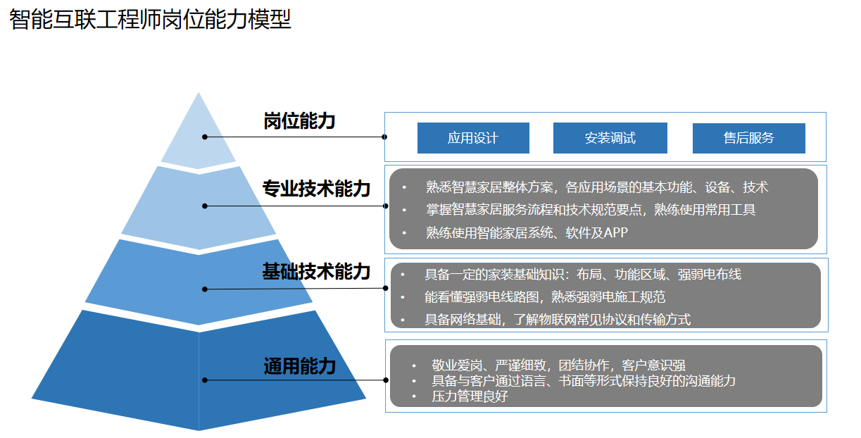 智能家居工程師分為三個(gè)級別,分別是智能家居服務(wù)工程師(初級)、智能家居應用設計工程師(中級)、智能家居硬件開(kāi)發(fā)工程師(高級)。各個(gè)級別的崗位定義,是根據現場(chǎng)工作場(chǎng)景中典型工作任務(wù)的難易度來(lái)確定的。