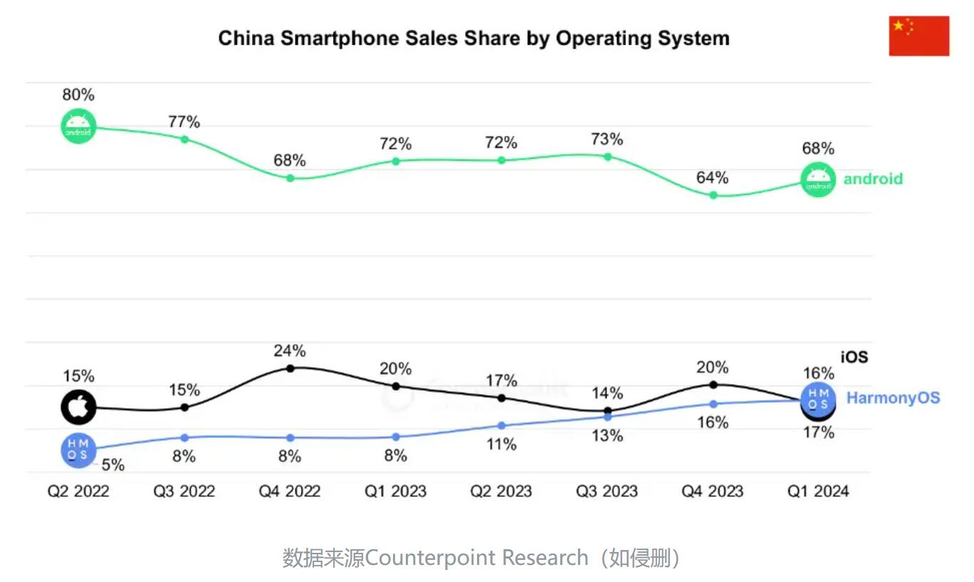 日前,據權威調查機構統計,華為鴻蒙系統在中國市場(chǎng)的份額由2023年一季度的8%飆升至2024年一季度的17%,首次超越蘋(píng)果iOS,榮登中國第二大手機操作系統的寶座,這一數據反映了鴻蒙系統在國內成為僅次于安卓系統的第二大操作系統。