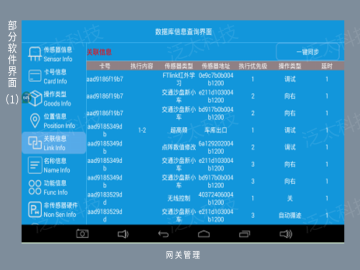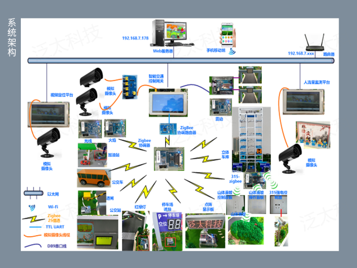 以城市道路交通為原型,融合了無(wú)線(xiàn)傳感器網(wǎng)絡(luò )、RFID射頻識別、圖像識別、無(wú)線(xiàn)通信、云服務(wù)、M2M中間件等物聯(lián)網(wǎng)先進(jìn)技術(shù),依托部署在交通沙盤(pán)中的智能車(chē)、紅綠燈、公交站、RFID設備、模擬攝像機、網(wǎng)絡(luò )攝像機、Android網(wǎng)關(guān)、圖像服務(wù)器等設備,實(shí)現智能車(chē)、紅綠燈控制、公交站自動(dòng)播報、路燈控制、智能停車(chē)場(chǎng)、違章抓拍、車(chē)牌識別、人流量檢測、公路災害智能預警等功能,為物聯(lián)網(wǎng)專(zhuān)業(yè)教學(xué)提供了一個(gè)完備的應用實(shí)訓系統。