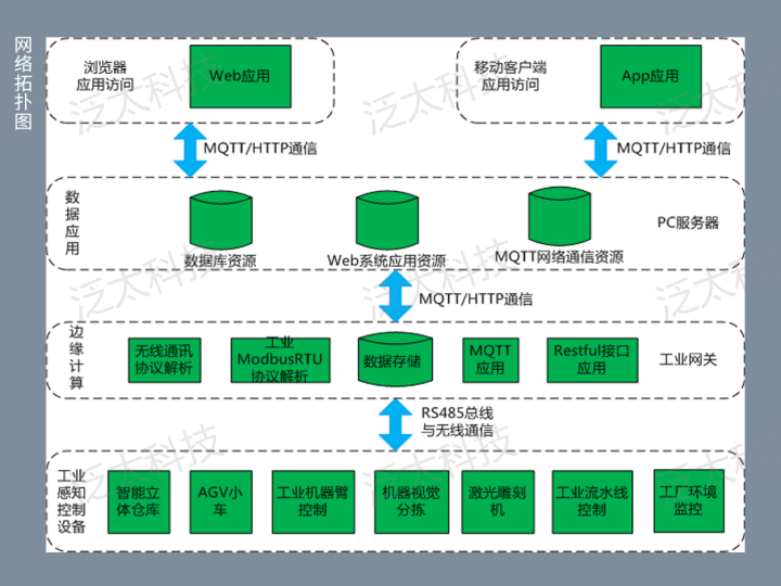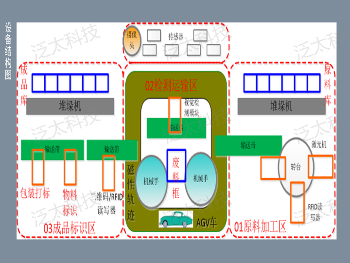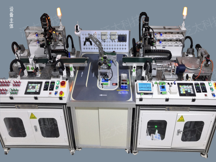 系統涵蓋立體倉庫堆垛機、加工轉臺、激光雕刻機、多自由度機器臂、AGV小車(chē)、機器視覺(jué)檢測裝置、流水線(xiàn)傳輸設備、RFID讀卡器、打碼裝置以及各種狀態(tài)監測傳感器,通過(guò)PLC電氣控制、嵌入式應用、AI機器視覺(jué)、工業(yè)現場(chǎng)總線(xiàn)和自組網(wǎng)通信等技術(shù),達到工業(yè)設備運動(dòng)控制、運行狀態(tài)監測,實(shí)現出庫、上料、寫(xiě)碼、雕刻、傳輸、檢測、運輸、打碼、讀碼、包裝、入庫等完整的工藝流程;通過(guò)智能網(wǎng)關(guān)和工業(yè)互聯(lián)網(wǎng)平臺,實(shí)現設備接入、數據采集、數據上云、產(chǎn)線(xiàn)管理、工件質(zhì)量分析、以及可視化應用。