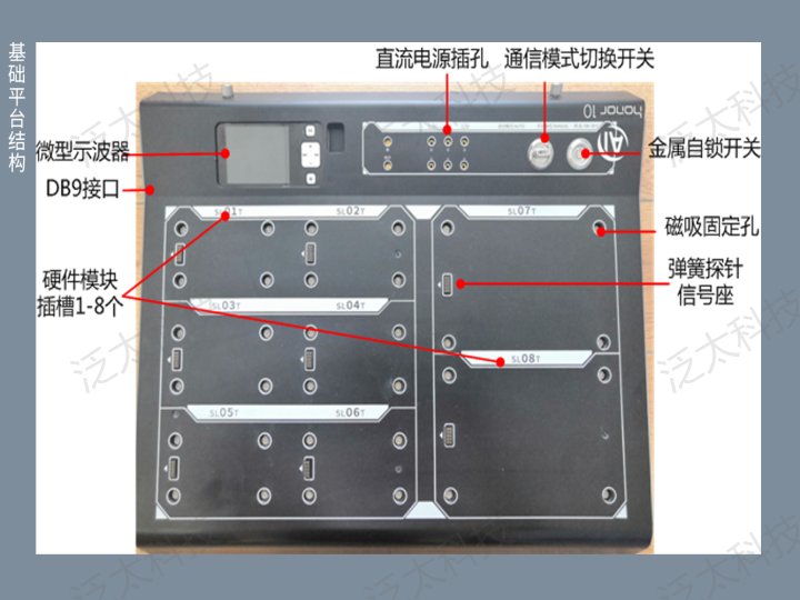 平臺結構符合人體工學(xué)設計,由分離式基座和網(wǎng)板組成。硬件模塊采用磁吸方式與基座連接固定,接觸式探針進(jìn)行供電和信號傳輸,使用方便,不易損壞管腳,易于拓展。場(chǎng)景引入式教學(xué)模式和豐富的教學(xué)資源,既可以支撐單個(gè)模塊單一知識點(diǎn)的學(xué)習,也支持多個(gè)模塊自由組合進(jìn)行多個(gè)知識點(diǎn)的綜合應用。